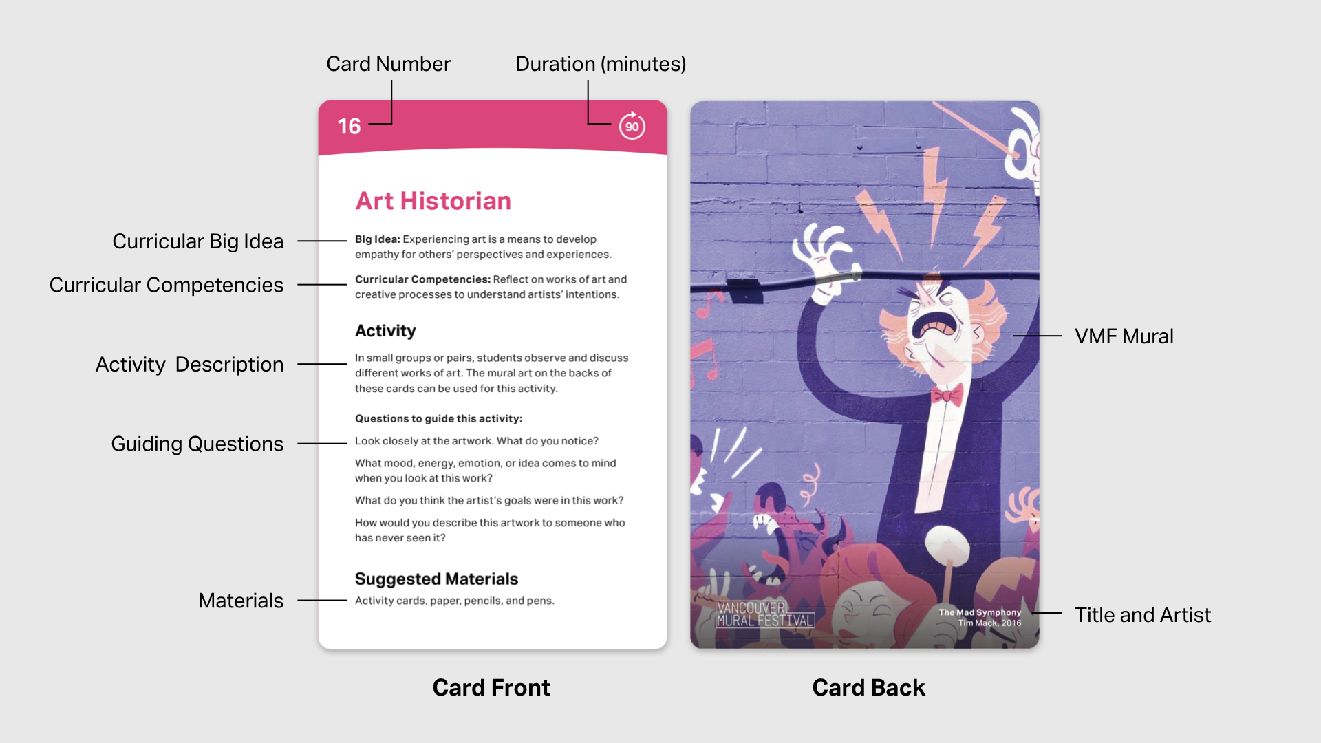 These cards aid teachers in integrating art education into the classroom. Modelled after the BC Ministry of Education Curriculum, featuring 1) a Big Idea which is a general statement and principle that represents what students are expected to understand or take away, 2) Curricular Competencies which describe what students should be able to do with the knowledge they gained, 3) a detailed description of a class activity, which includes 4) a set of guiding questions for teachers to ask students and prompt deeper thinking, and 5) suggested materials and supplies for the activity, and the expected duration.