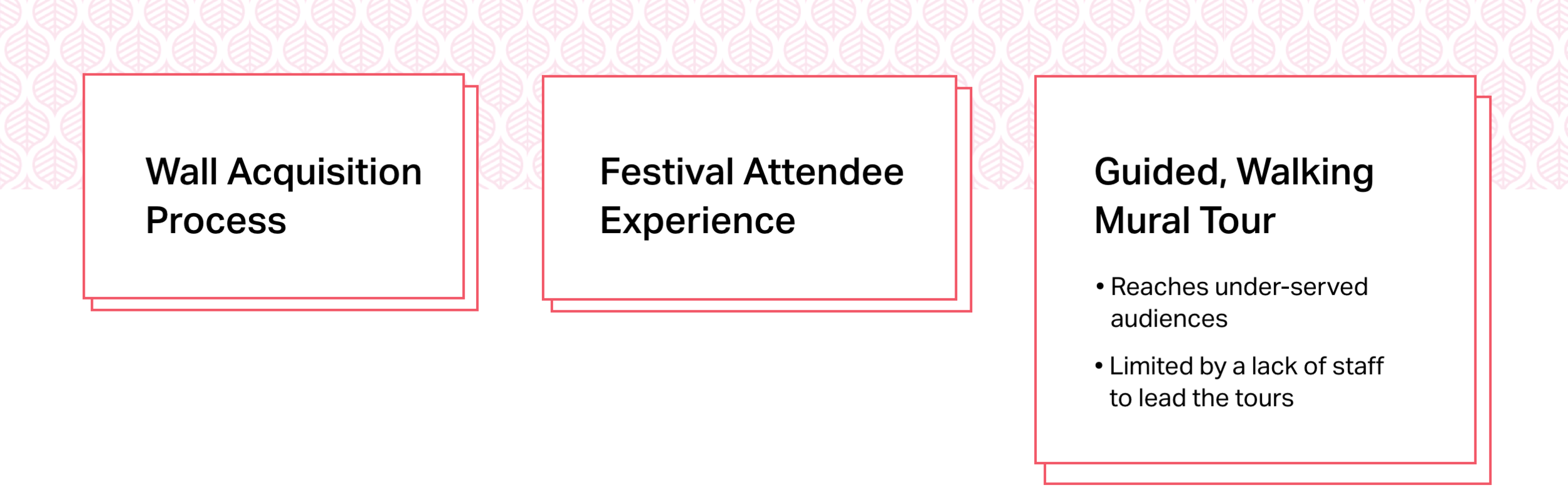 In our initial research, we conducted interviews with members of the VMF executive team, as well as artists, curators, and business owners around Mount Pleasant. Through these meetings, we surfaced three opportunities for design which were 1) the process of acquiring walls, 2) the festival experience, and 3) the walking mural tour.