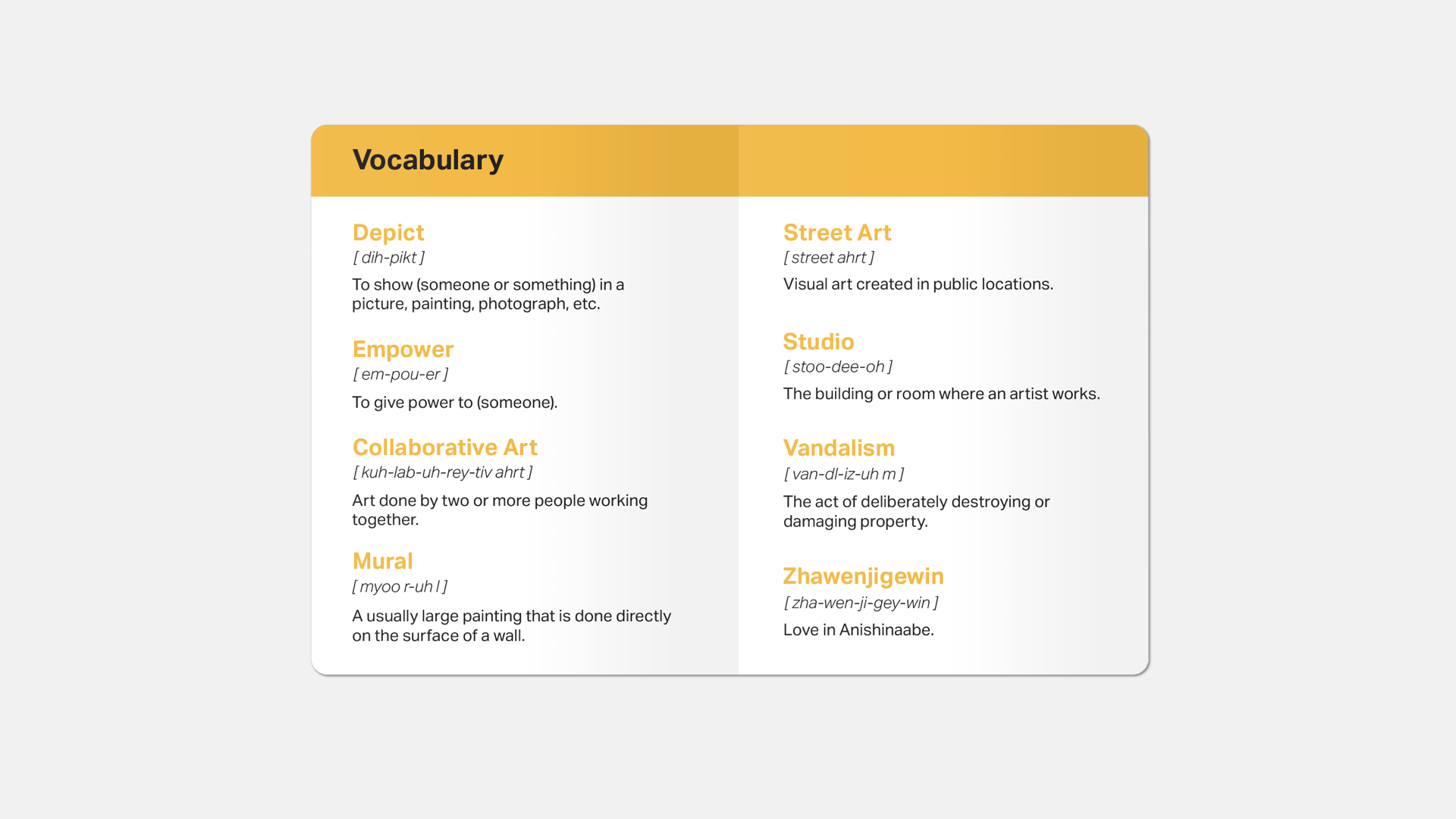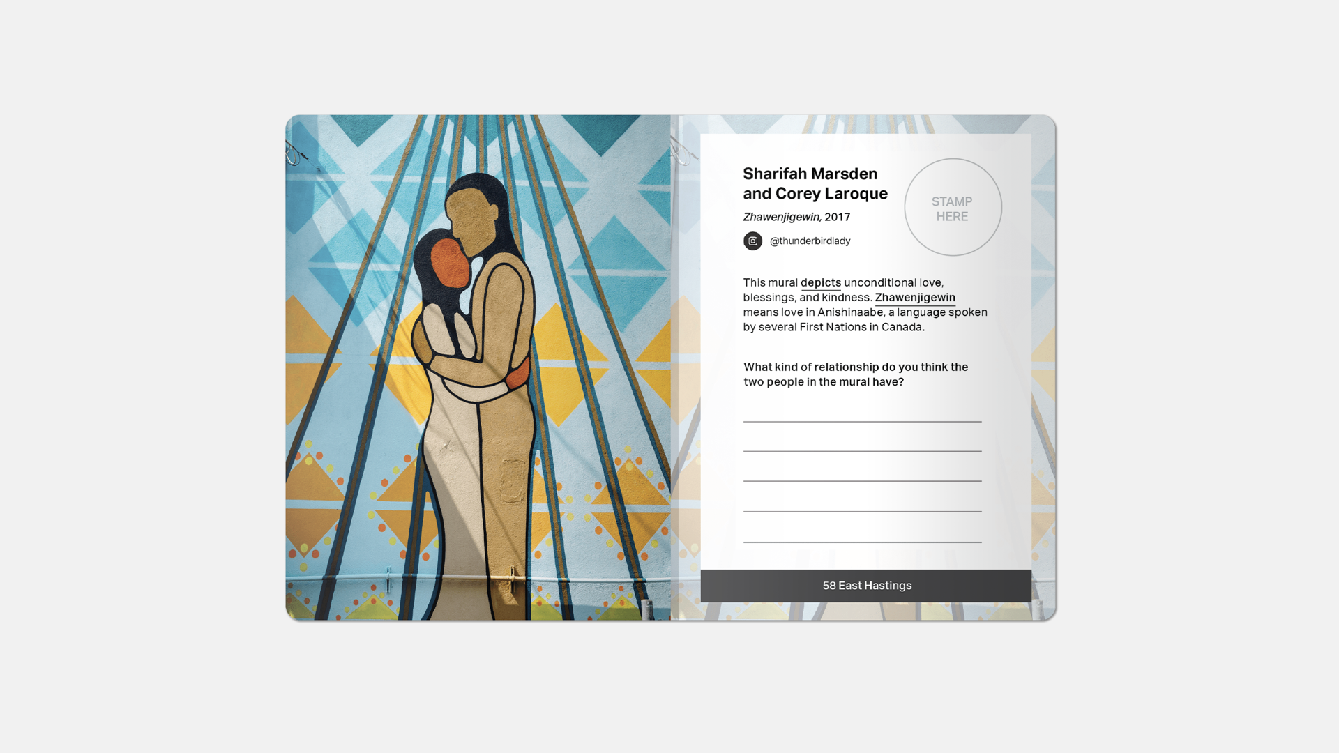 During user testing, teachers appreciated the inclusion of a photo of the mural as not all students might be able to physically visit the mural. Similar to the guiding questions done in the activity cards in classrooms, several teachers suggested we include reflective questions here as well to prompt students to think about, reflect, and explore their own thoughts and perceptions of each artwork on their own time.